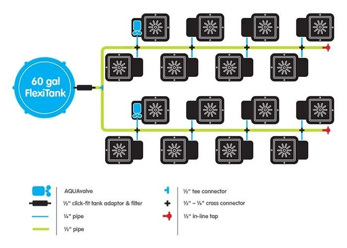 - (16) Accessory Pack – includes (1) AQUAvalve 5, 3.3′ of 3/8″ tubing, (1) Root Control Square, (1) 3/8″ tee for connecting to existing systems, (1) 1/2″-3/8″ tee for connecting to existing systems and (1) full instructions)