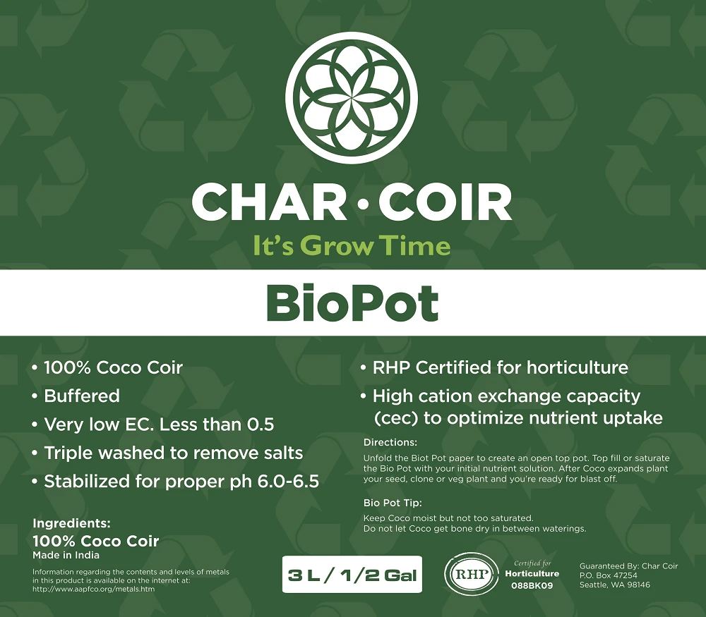 Char Coir is making things a lot easier with the BioPots. Premium lab-tested coco coir has been compressed and packaged in a non-woven paper wrapper. These are open-topped for easy hydration and available in 4″, 3 liter and 8 liter. You simply open the box, unfold the wrapper and hydrate. It’s that easy.