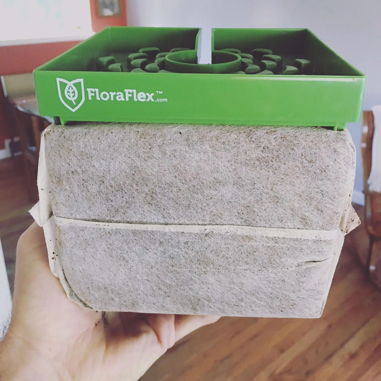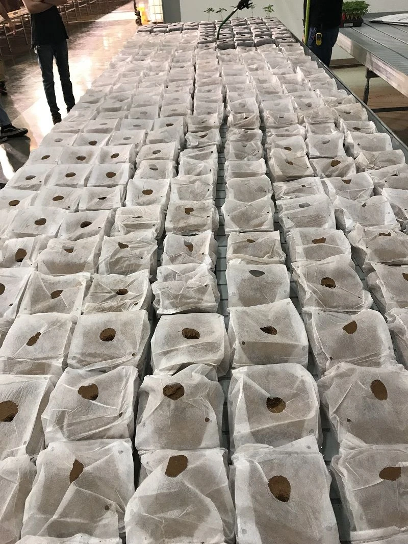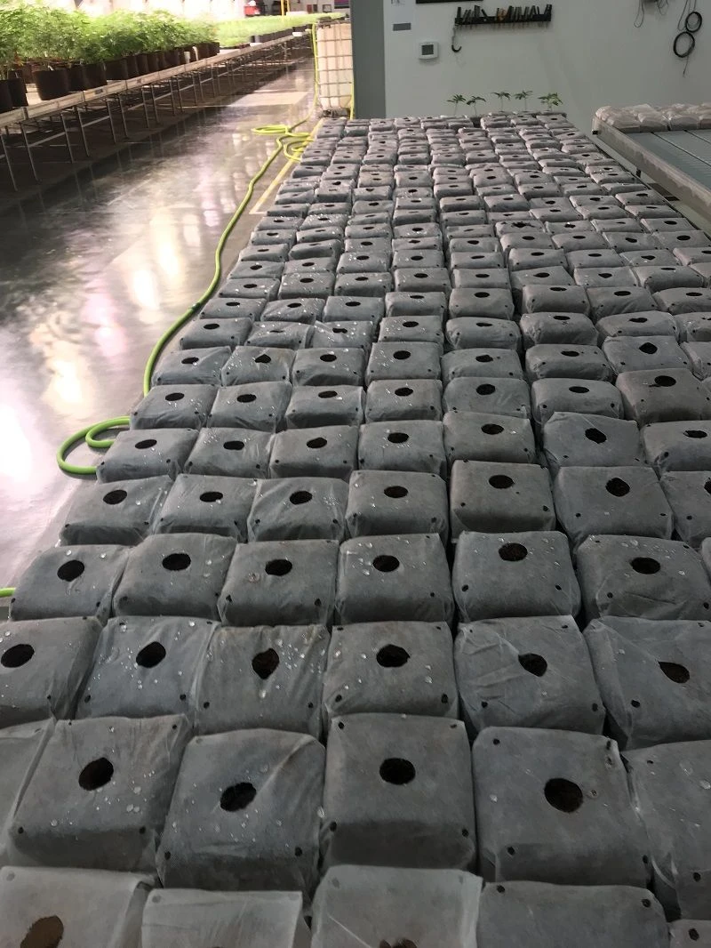 There are several ways to initially hydrate the cube but it’s best to hydrate the block from both the bottom and the top. We recommend the following method. For larger grows, place cubes in a flood & drain table. Pull up slightly on the outer sleeve to create a “tent” in the material. Irrigate briefly with a watering wand in order to anchor the cubes down so they don’t float during the next step. Then, flood the table to complete the hydration process. Cubes are now ready for planting.