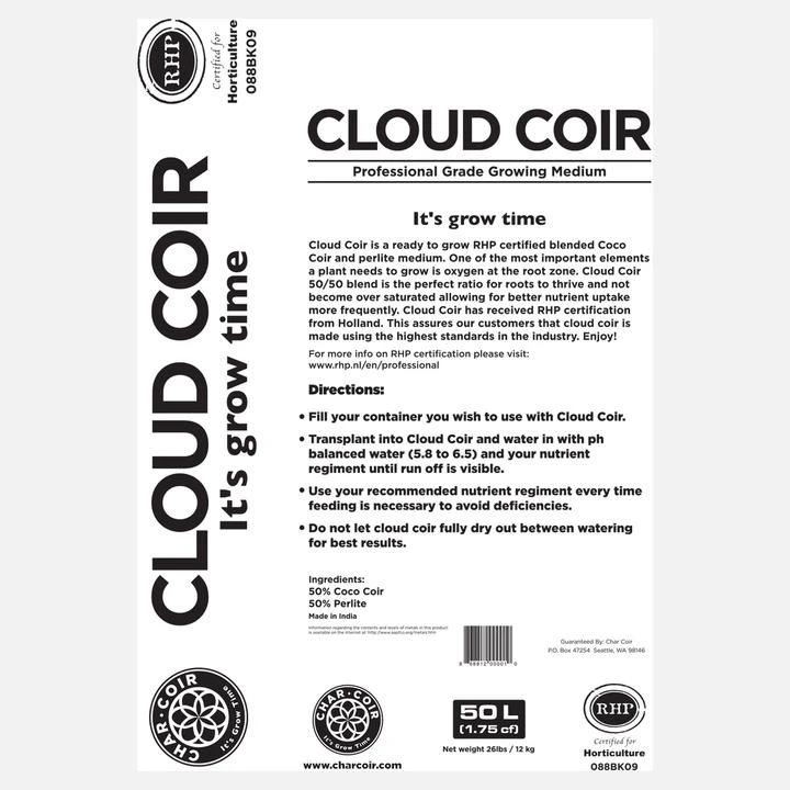 Cloud Coir is a ready-to-grow, RHP-certified blendded Coco Coir and Perlite medium. One of the most important elements a plant needs to grow is oxygen at the root zone. Cloud Coir 50/50 blend is the perfect ratio for roots to thrive and not become over saturated, allowing for better nutrient uptake more frequently. Cloud Coir has also received RHP certification from Holland.