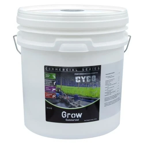 Cyco Commercial Grow is great for all hydroponic applications such as drip systems, DWC, rock wool, coco and it is also suitable for all soil applications. Cyco Commercial is compatible to all water types with no changes needed to the mixture or the amount used. When you dissolve Commercial Grow into your water, it is visibly clear and leaves no residue. Our commercial range of products contains all the added macros, micros and amino’s that are needed to grow and flower a perfect crop with no extra additives needed, or additives can be added if the grower desires different specifications, for optimum results. Use 1 – 2 teaspoons per gallon fresh water (5 – 10 grams per 4 liters fresh water). For soil apply nutrient once or twice weekly and use plain water between applications. For hydroponics change the nutrient reservoir weekly. Use mild strength nutrient for delicate plants and full strength nutrient for robust plants.
