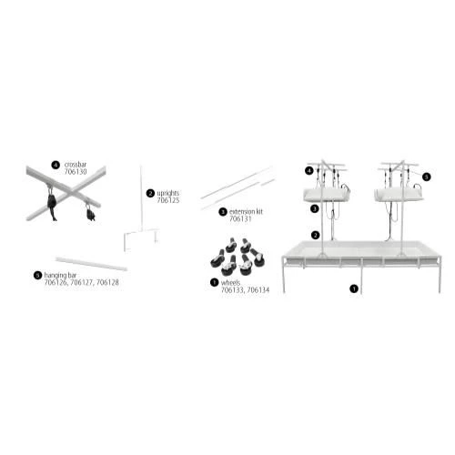 - Sturdy hanging bar comes in 2′, 3′, and 4′ sizes (706126, 706127, 706128).