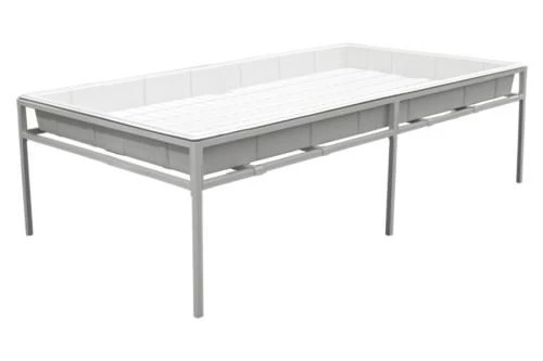 Heavy duty 3 ft x 6 ft quick assembly tray stand. Absolutely no tools required. Can be assembled in 5 minutes or less. Accommodates all popular brand trays and reservoirs. Overall height is 25 in. Height from bottom bar to floor is 18 in without casters. Outside dimensions: 79 in length by 41.25 in wide. Inside dimensions: 77 in length by 39.25 in wide. US Patent 8,714,498, Patent Pending 14/269,619, PCT Application CT/US12/00001 and Chinese Patent 201280018267.2. Tray sold separately.
