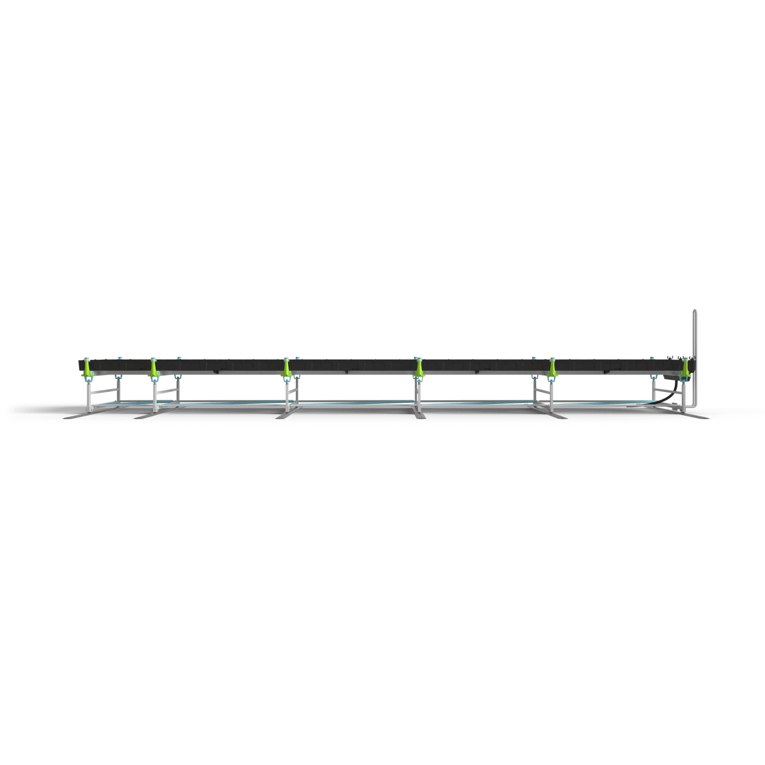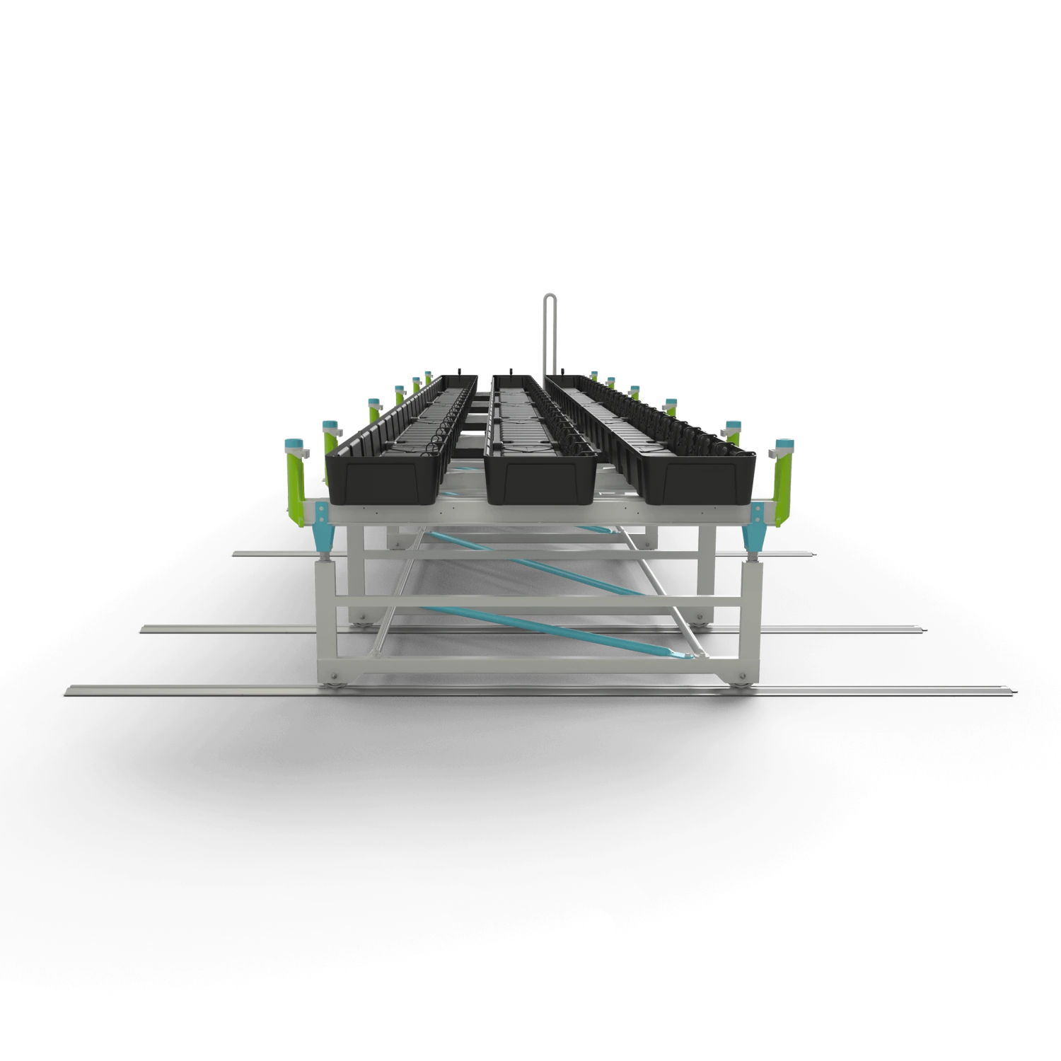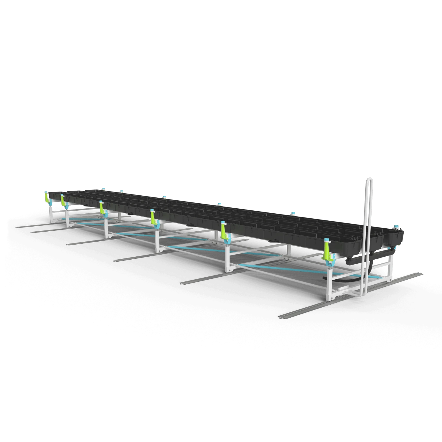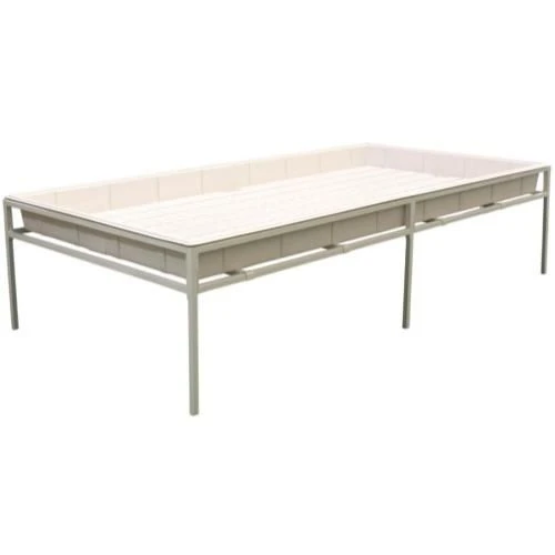 Heavy duty 4 ft x 8 ft quick assembly tray stand. Absolutely no tools required. Can be assembled in 5 minutes or less. Accommodates most popular brand trays and reservoirs. Overall height is 25 in. Height from bottom bar to floor is 18 in without casters.