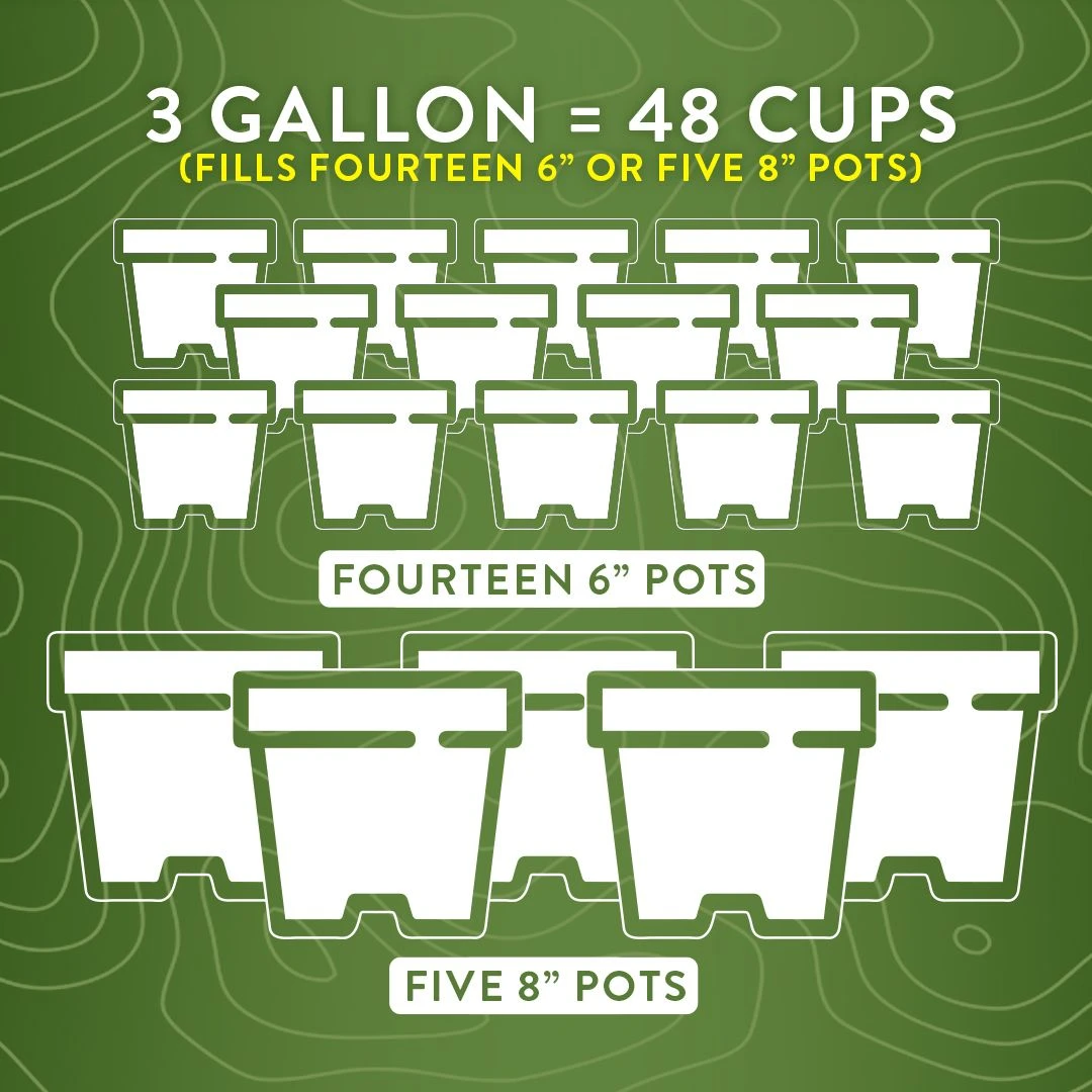3 gallon = 48 cups = (fills fourteen 6” or five 8” pots)