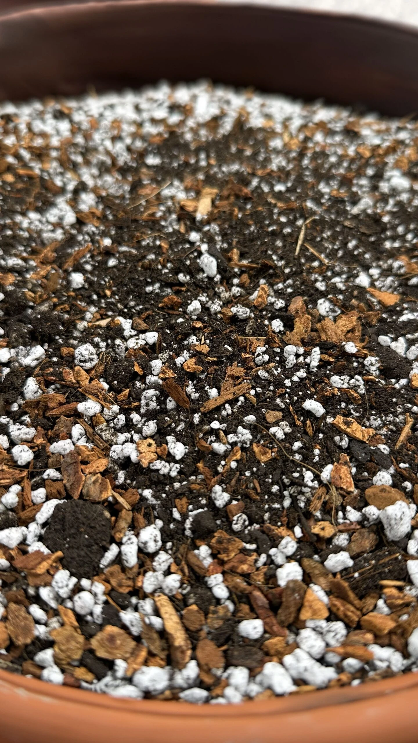 We use perlite #4 in this mix instead of LECA. This perlite is super chunky, retains less water and more oxygen, and is softer and gentler on delicate roots. We also add pumice to provide diversity to the size of the aggregates we use, and to add weight to the mix that LECA would normally provide.