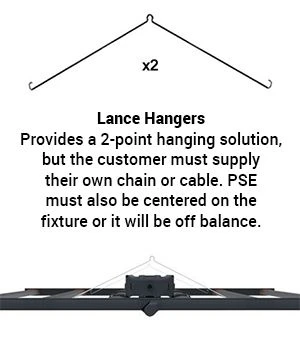 This genuine Fluence Mount provides a 2-point mounting solution but you must supply your own chain or cable to connect between the ceiling and each the Lance Hangers. PSE (power supply) must also be centered on the fixture or it will be off balance.