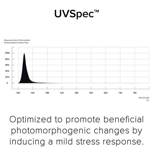 With a peak wavelength of 400nm, UVSpec™ is designed to provide beneficial photomorphogenic responses by creating a mild stress response in plants. When applied incorrectly, research shows UV stress causes photoinhibition of chloroplasts, resulting in lower biomass production, photobleaching and death of leaves.