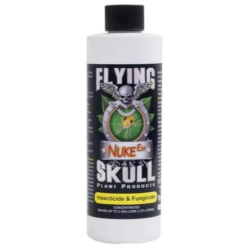 Nuke Em® insecticide/fungicide is a pesticide that has been proven effective in both hobby and commercial grows and its purity is verified. It targets all species of broad mites, russet mites, spider mites, leaf aphids, whitefly and other plant leaf parasites. Its unique formula also allows for outstanding control of powdery mildew found in the garden. Nuke Em® uses ingredients that are either food grade or organic listed, which makes it skin contact friendly. Nuke Em® does not have any heavy oils or detergents in the formula that could slow plant growth or make produce taste bad. It may be applied throughout the grow cycle, and if need, after harvest. Commercial growers will be happy to know that Flying Skull is very serious about Nuke Em®’s quality. Flying Skull Plant Products has identified 59 unlawful pesticide ingredients known to fail laboratory testing of food-grade produce. Each batch of Nuke Em® has been laboratory tested for purity to make sure those 59 unlawful pesticide ingredients, along with yeast, mold and bacteria, are not in Nuke Em®.