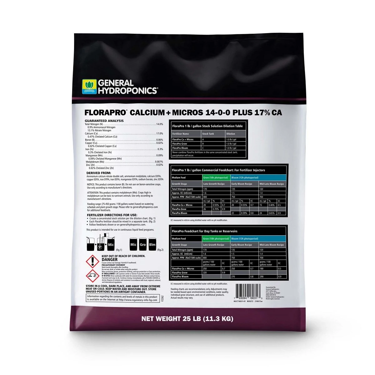 Specifically designed for use in commercial cultivation. FloraPro Calcium+Micros 14-0-0 plus 17% Ca fertilizer will provide your plants with excellent concentrations of Calcium and micronutrients. FloraPro Calcium + Micros 14-0-0 plus 17% Ca is meant to be used as part of the FloraPro product system to provide a complete fertilizer program.