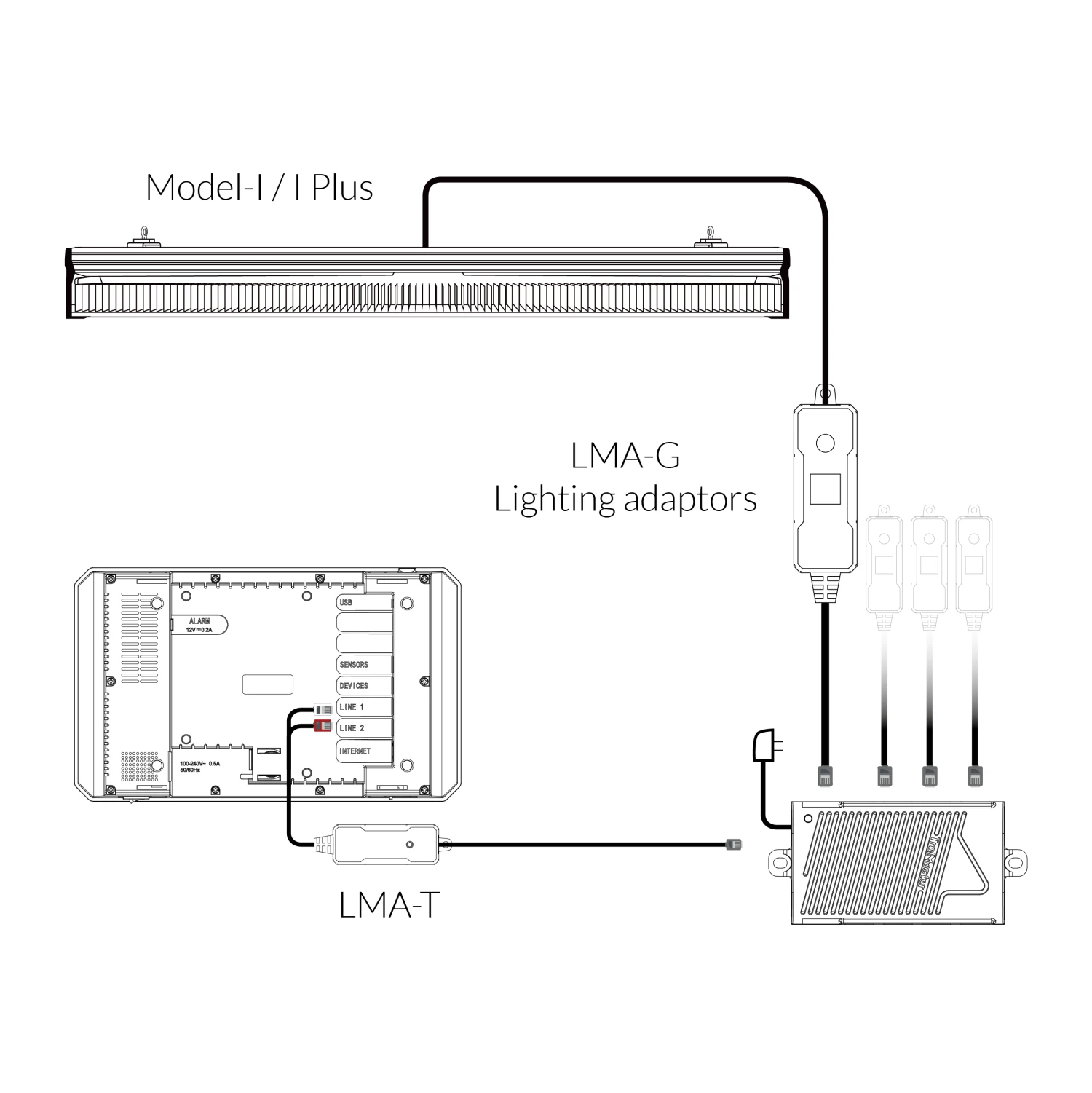 LMA-G is specially designed to be used with ThinkGrow single-bar fixtures, i.e. Model-I and I Plus. The LMA-G needs to be connected with a lighting control adaptor to offer a group control function to the grow lights. Each LMA-G can control one group of lights. Each light group requires one LMA-G, which needs to be connected inline with the LMA-T lighting control adapter to activate the group control function. Up to 10 groups of lights can be created, each with individual settings.