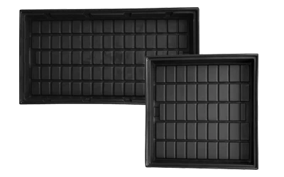 Made of black 100% recycled ABS plastic with virgin ABS cap on each side. Manufactured In the USA using 25% solar energy. Easy clean drainage grid allows the grower to clean their trays without the hassle of scrubbing sharp corners to remove build up. Built in water level indicators to easily identify the fill level in the trays.