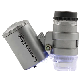 Illuminated with 3 LED lights. Focus adjusting lens barrel. Battery operated. 60x magnification. 2 light settings – high and low. On/Off switch. Includes storage case.