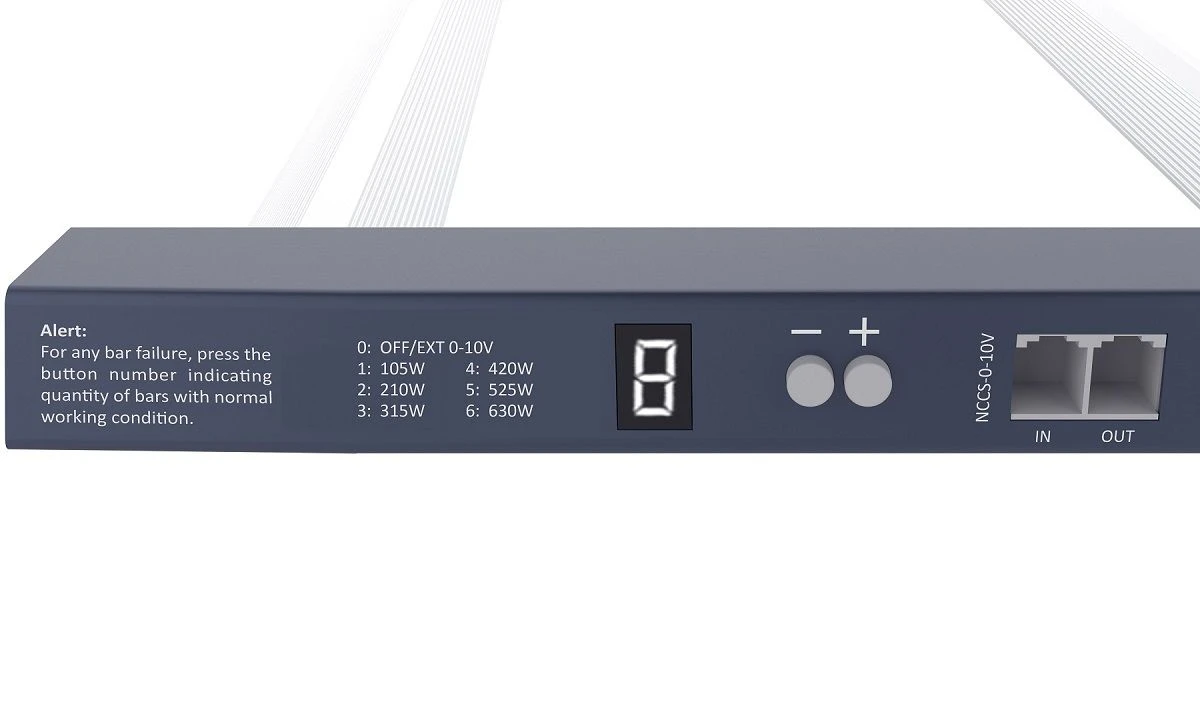 - Digital control buttons are used for smart digital dimming with dimming ranges of 105W, 210W, 315W, 420W, 525W, and 630W