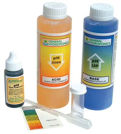The pH Control Kit by General Hydroponics includes everything need to check and maintain proper pH for soil or hydroponic gardens. Testing solution reads a wide spectrum from 4.0 to 8.5. Simply fill the test-tube halfway with nutrient, add a few drops of pH Test Indicator, and observe the coloration of the liquid in the test vial. Use the included 8oz. pH Up and Down solutions to correct your pH as necessary.