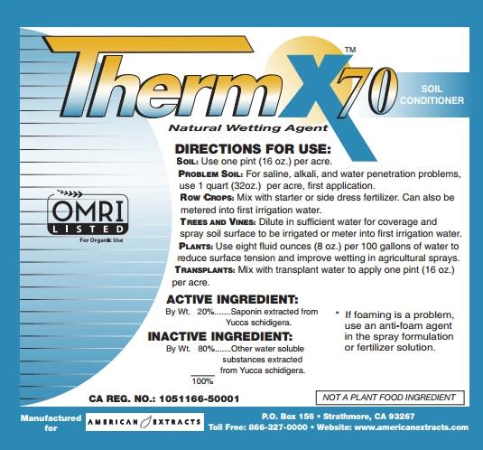 Water and nutrients are wasted if they aren’t used by the plants. The root systems are often denied the water and nutrients needed because of soil compaction, poor water penetration and subbing, and by the action of excess salinity and alkali. ThermX relieves these stresses, increasing crop yields.American Extracts supplies different agriculture products to suit everyone’s application needs. All are made from 100% natural yucca. The products are registered with California Department of Agriculture and with Organic Materials Review Institute.
