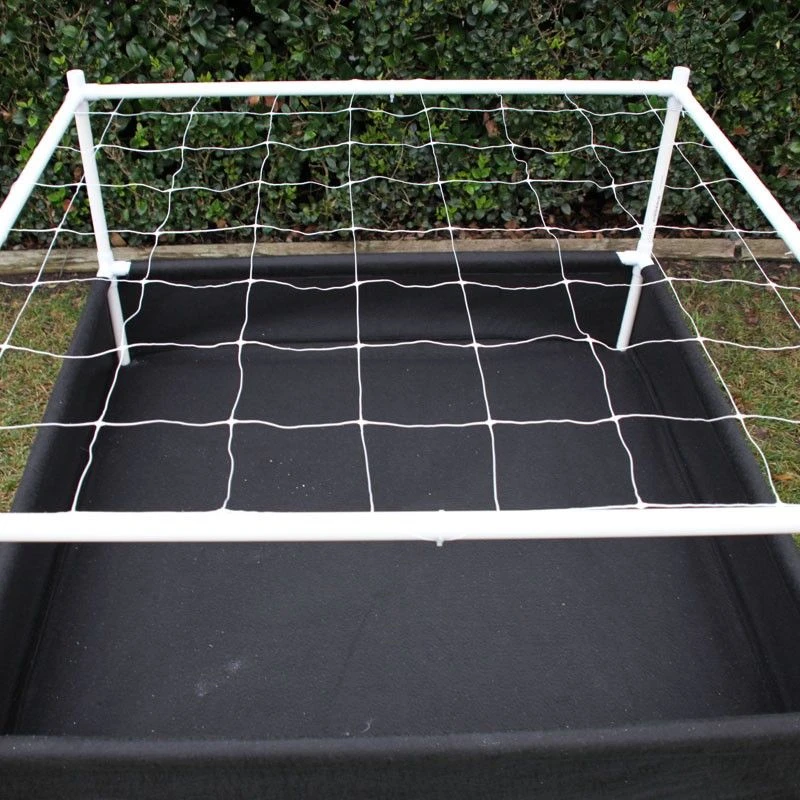 Geo Planter now offers trellis netting kits that make supporting your plants fast and easy. The kit includes 4′ x 4′ or 4′ x 8′ netting (6″ squares), 4 four-way 3/4-inch fittings and zip ties that can be used to attach to the Geo Planter or used to create your own trellis support system. Please note that the trellis kit does not include the pvc frame; PVC can be purchased at your local hardware store and cut to make the trellis whatever height you desire.